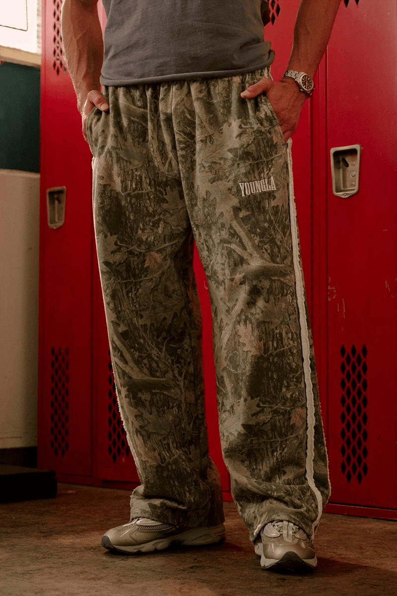 Elevate your streetwear game with the Youngla 2124 - Vintage Striped Sweats Dark Tree Camo. These sweats combine heavyweight comfort with a striking retro style, perfect for anyone looking to make a bold statement.