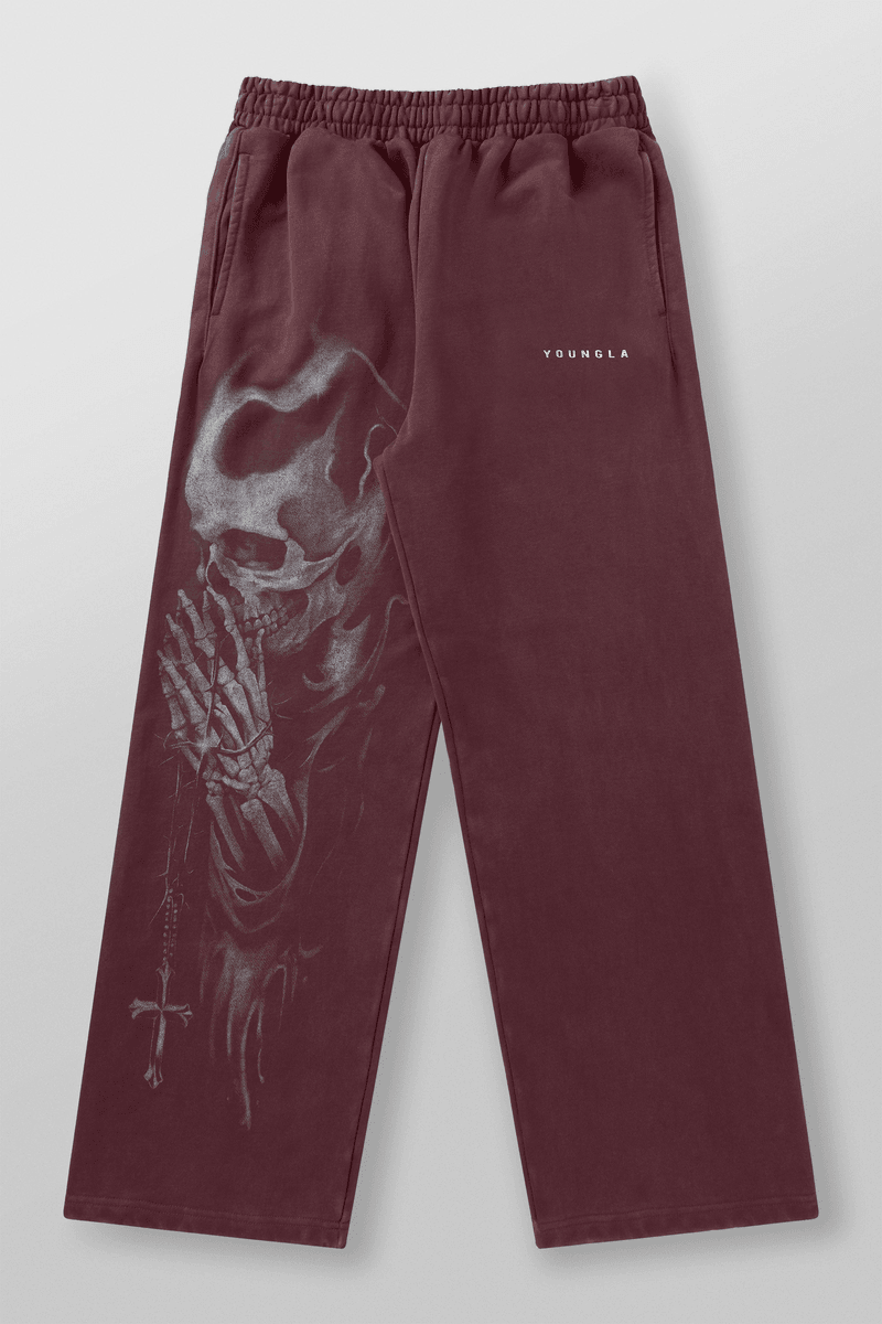 The Youngla 2125 - Divine Sweats Burgundy Wash stands out with its unique design and superior quality. Crafted from premium 100% cotton, these sweatpants feature an ultra-heavyweight fabric that provides both durability and a luxurious feel. The eye-catching printed skull graphic on the left leg adds a touch of edge, making these sweatpants a versatile addition to any outfit.