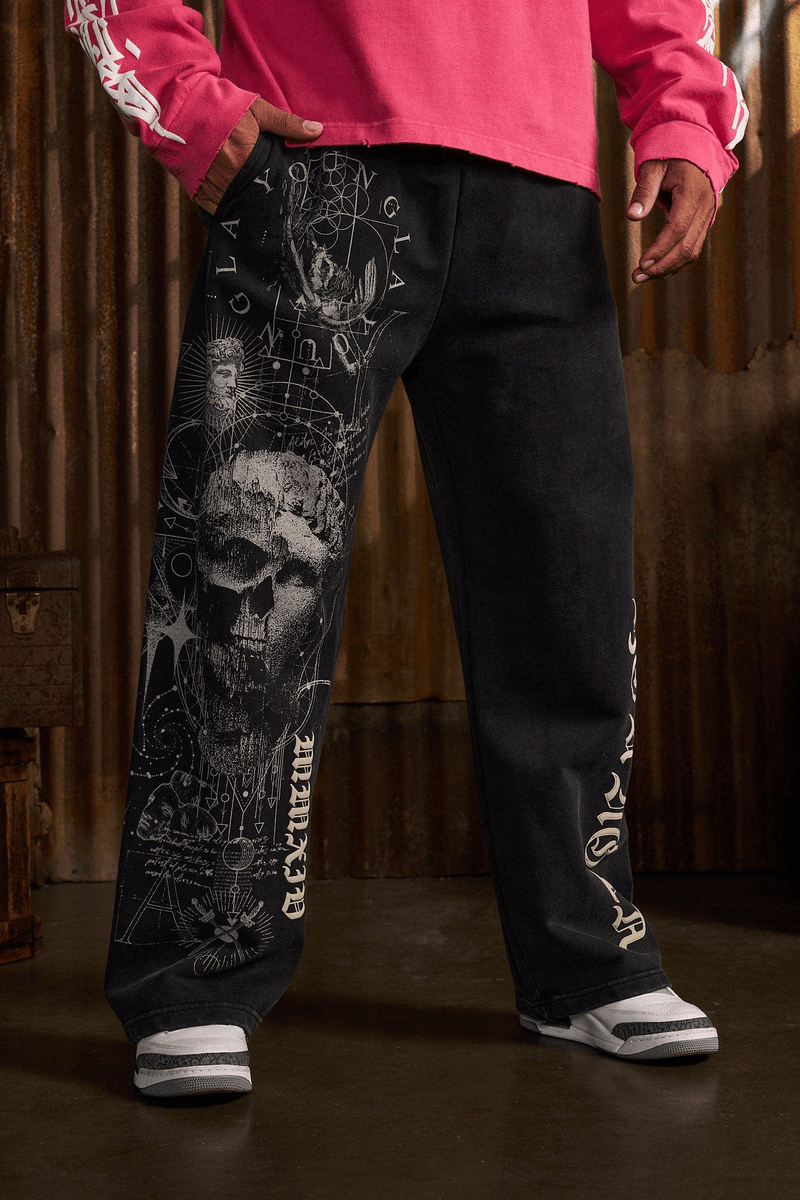 The Youngla 2139 - Renaissance Sweats Dark Grey Wash seamlessly blends comfort and style. The eye-catching graphics tell a story, making these sweats an artistic statement piece. Perfect for lounging at home or casual outings, they pair effortlessly with your favorite tees and sneakers.
