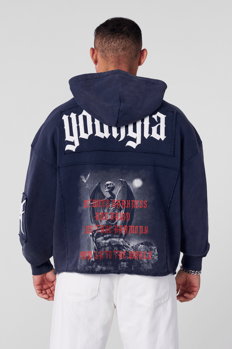Introducing the Youngla 5025 - Patch Hoodie Navy Wash, your new go-to piece for effortless streetwear style. This heavyweight hoodie is designed to elevate your wardrobe with its striking gothic lettering and oversized reaper graphic, making it a must-have for anyone looking to stand out.