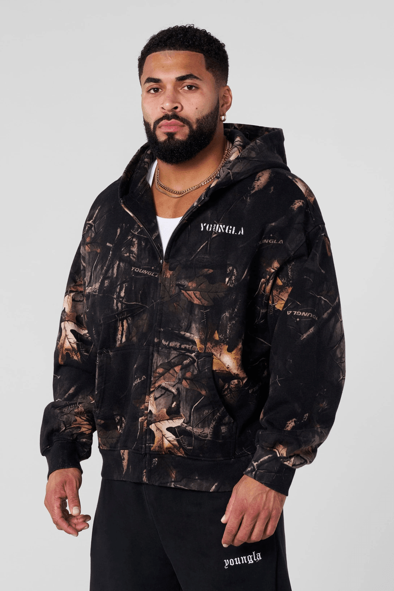 The Youngla 5116 - Tree Camo Collection - Zip Ups Black Tree Camo is not just a jacket; it’s a statement piece. Made from substantial 420 gsm terry cotton, it provides warmth without the bulk. Whether you're heading out for a casual day or layering up for outdoor adventures, this zip-up is your perfect companion. The model featured is 5'11" and wearing a size large, showcasing the versatile fit for various body types.
