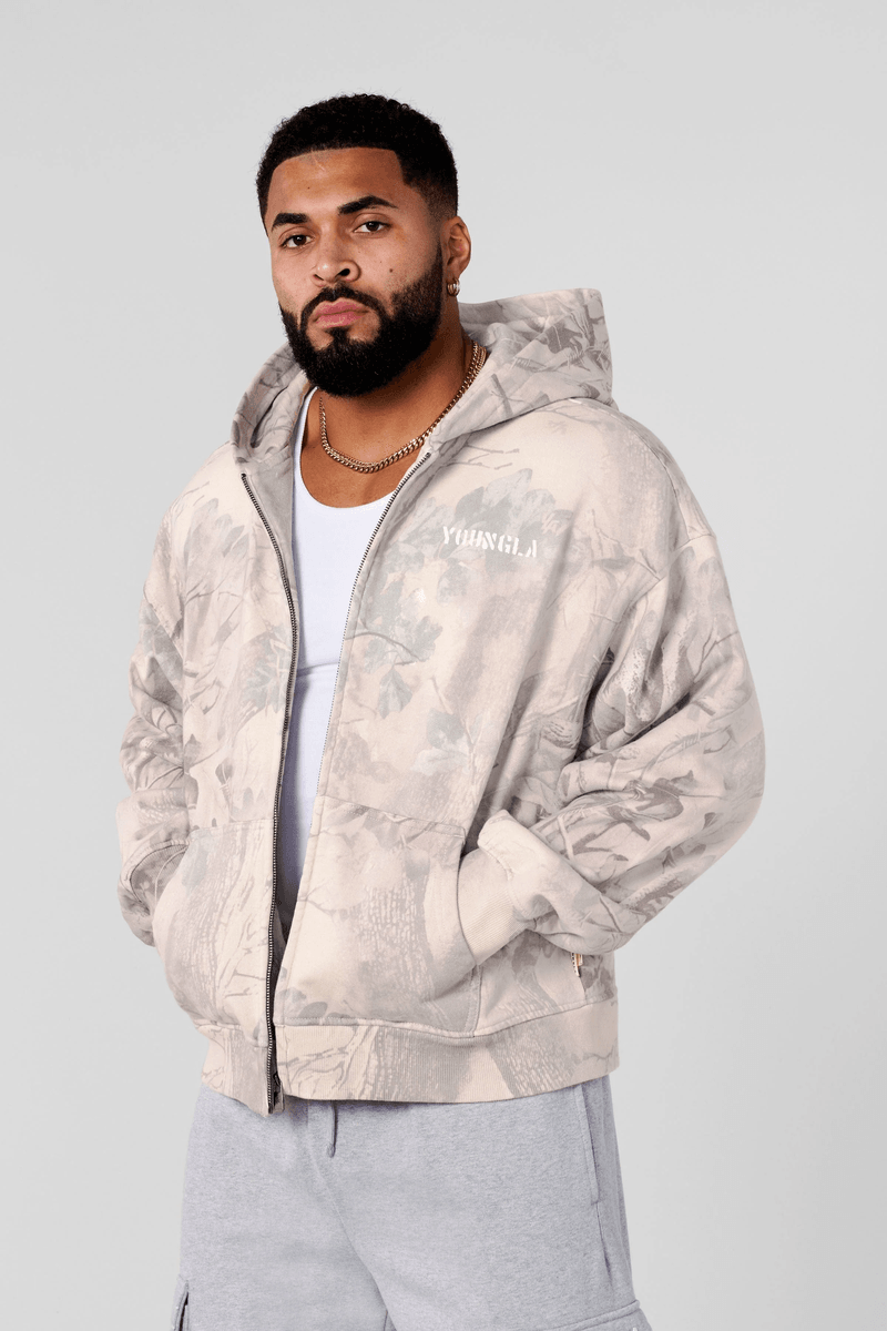 The Youngla 5116 - Tree Camo Collection is crafted from 420 gsm terry fabric, offering a substantial feel without the bulk. This zip-up is perfect for layering over your favorite tees or under jackets when the temperature drops. With its unique desert tan tree camo design, you'll stand out in style while enjoying maximum comfort.
