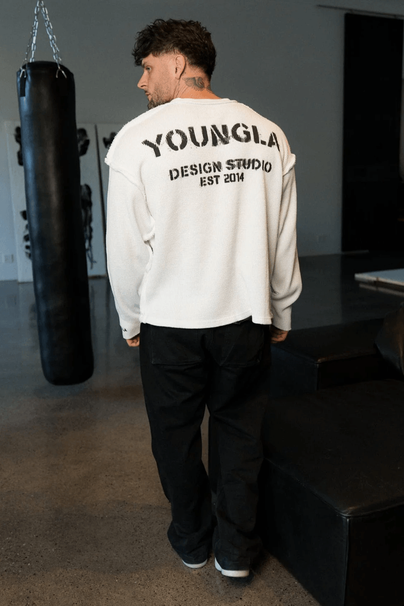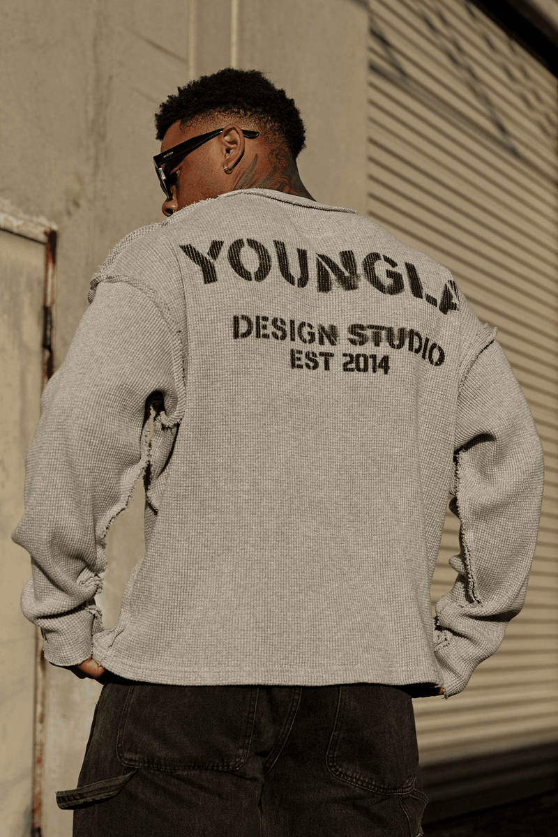 Elevate your wardrobe with the Youngla 5158 - Deconstructed Stencil Thermal Heather Grey. This unique longsleeve combines rugged style with vintage charm, making it a must-have for any fashion-forward individual.