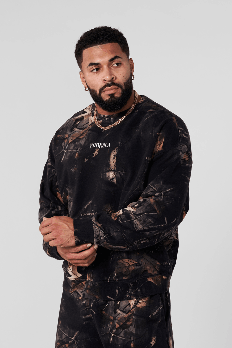 The Youngla 5206 - Tree Camo Collection - Crewnecks Black Tree Camo is more than just a sweatshirt; it's a statement piece. With its unique tree camo print, this crewneck adds a bold touch to any outfit. Whether you're hitting the gym or heading out for a casual day, this crewneck transitions effortlessly to fit your lifestyle.