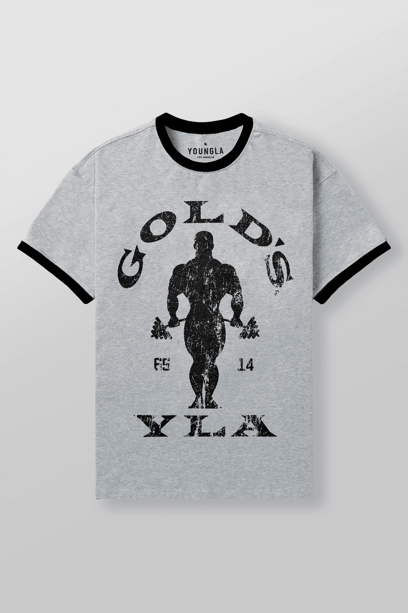 Elevate your workout wardrobe with the Youngla 4009 - Golds Gym Ringer Tees in Heather Grey. This stylish tee combines classic design with modern comfort, making it the perfect choice for gym enthusiasts and casual wear alike.