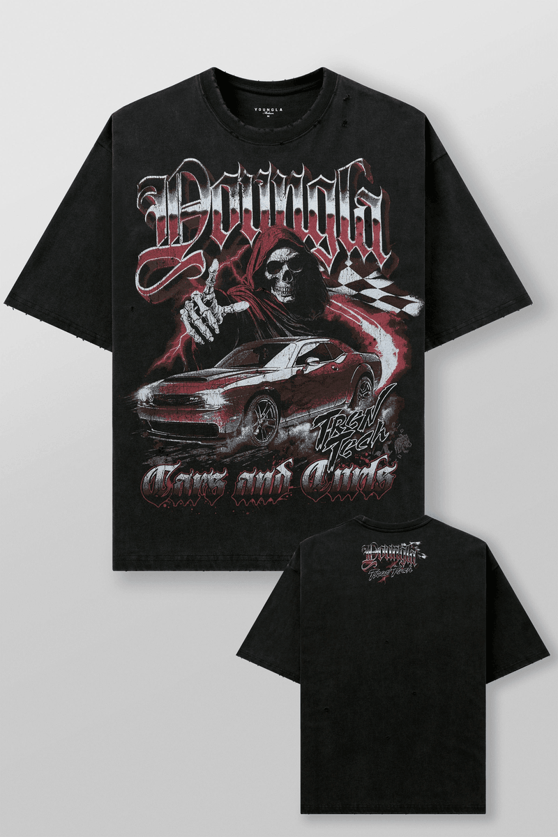 The Youngla 4103 - Cars & Curls - Tees Last Ride features a striking graphic that captures the essence of nostalgia while maintaining a modern edge. Its oversized fit ensures that you stay comfortable whether you're hitting the gym or hanging out with friends. The soft cotton jersey fabric feels great against your skin and allows for easy movement. Perfect for layering or wearing solo, this tee is a versatile addition to your wardrobe.