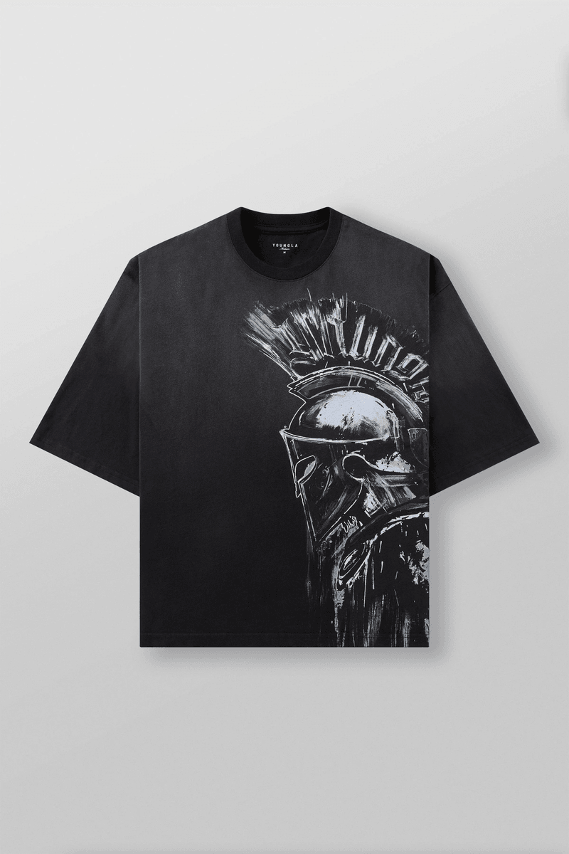 Experience bold style and unmatched comfort with the Youngla 4119 - Spartan Tees Black Wash. This oversized tee embodies warrior spirit through its striking hand-drawn helmet graphic that wraps around the shirt, making it a standout piece for any streetwear enthusiast.