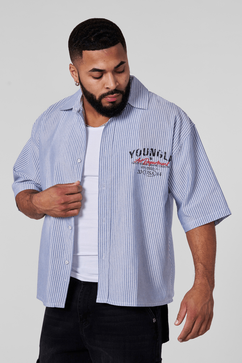 Elevate your summer wardrobe with the Youngla 4131 - Industry Button-Ups Blue. This loose-fitting shirt offers a fresh twist on the classic workwear look, making it a must-have for any casual outing or layered style.