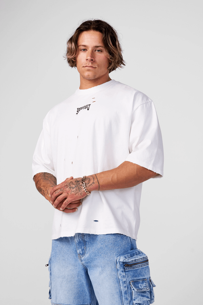 Elevate your street style with the Youngla 4144 - Distressed Tees Off-White. This essential oversized tee combines comfort with an edgy design that stands out in any wardrobe.
