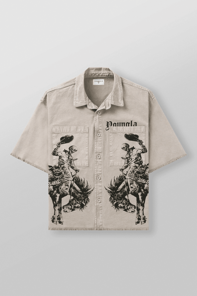 Discover the perfect blend of style and rugged charm with the Youngla 4231 - Hats Off Button Ups Cream Wash. This striking short-sleeve button-up shirt is designed for those who embrace the untamed spirit of the wild west, making it a bold statement piece for any wardrobe.