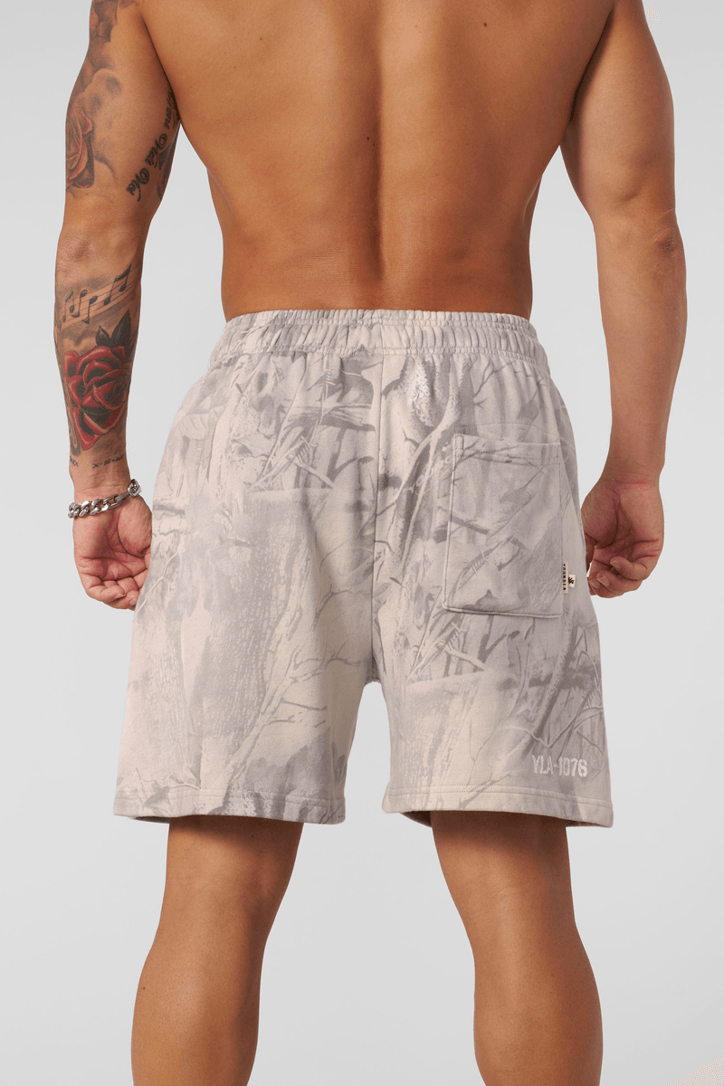 The Youngla 1076 - Tree Camo Collection - Shorts Beige Tree Camo combines functionality and fashion seamlessly. Made from premium 100% cotton terry fabric, these shorts provide a soft touch while maintaining breathability. The baggy fit allows for unrestricted movement, making them ideal for everything from workouts to casual outings.