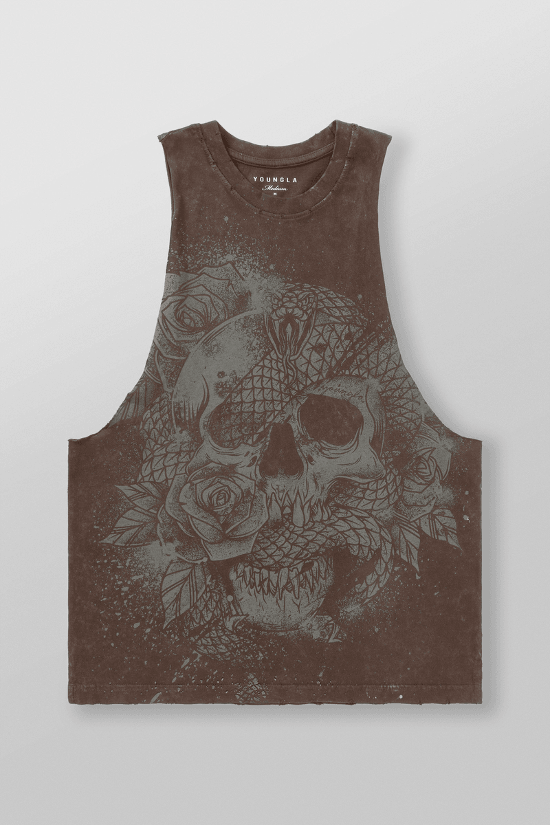 Introducing the Youngla 3028 - Eternal Coil Tanks Brown Wash, where style meets functionality. This tank top is designed to elevate your workout experience while showcasing your fierce side with its stunning snake and skull graphic.