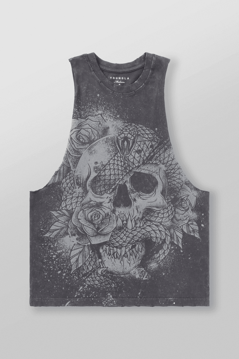 Elevate your workout wardrobe with the Youngla 3028 - Eternal Coil Tanks Grey Wash. This striking tank top combines style and performance, featuring an eye-catching snake and skull graphic that reflects your inner strength. Crafted from 100% cotton, this tank provides the ultimate comfort and breathability during your most intense workouts.