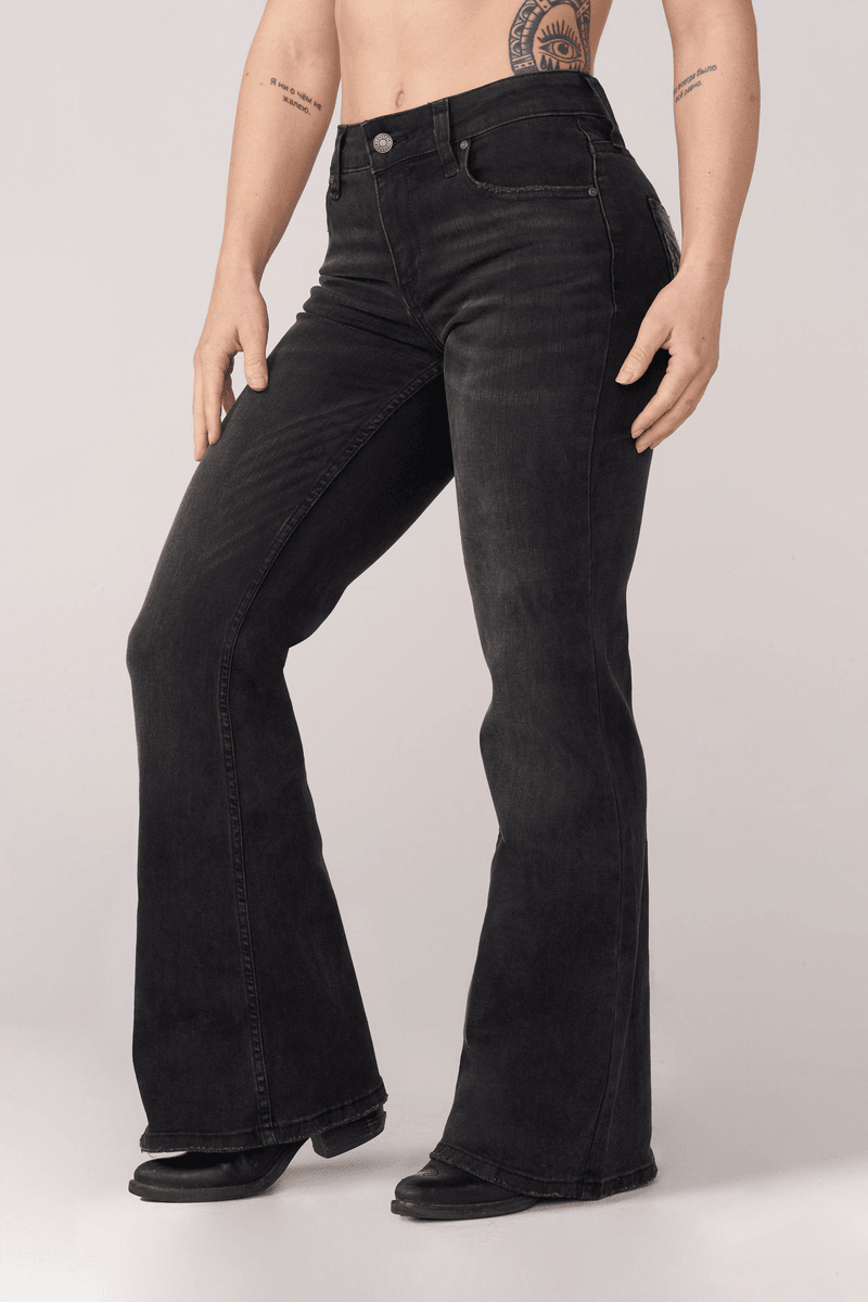 Discover the Youngla W258 Winged Flare Jeans Black Wash