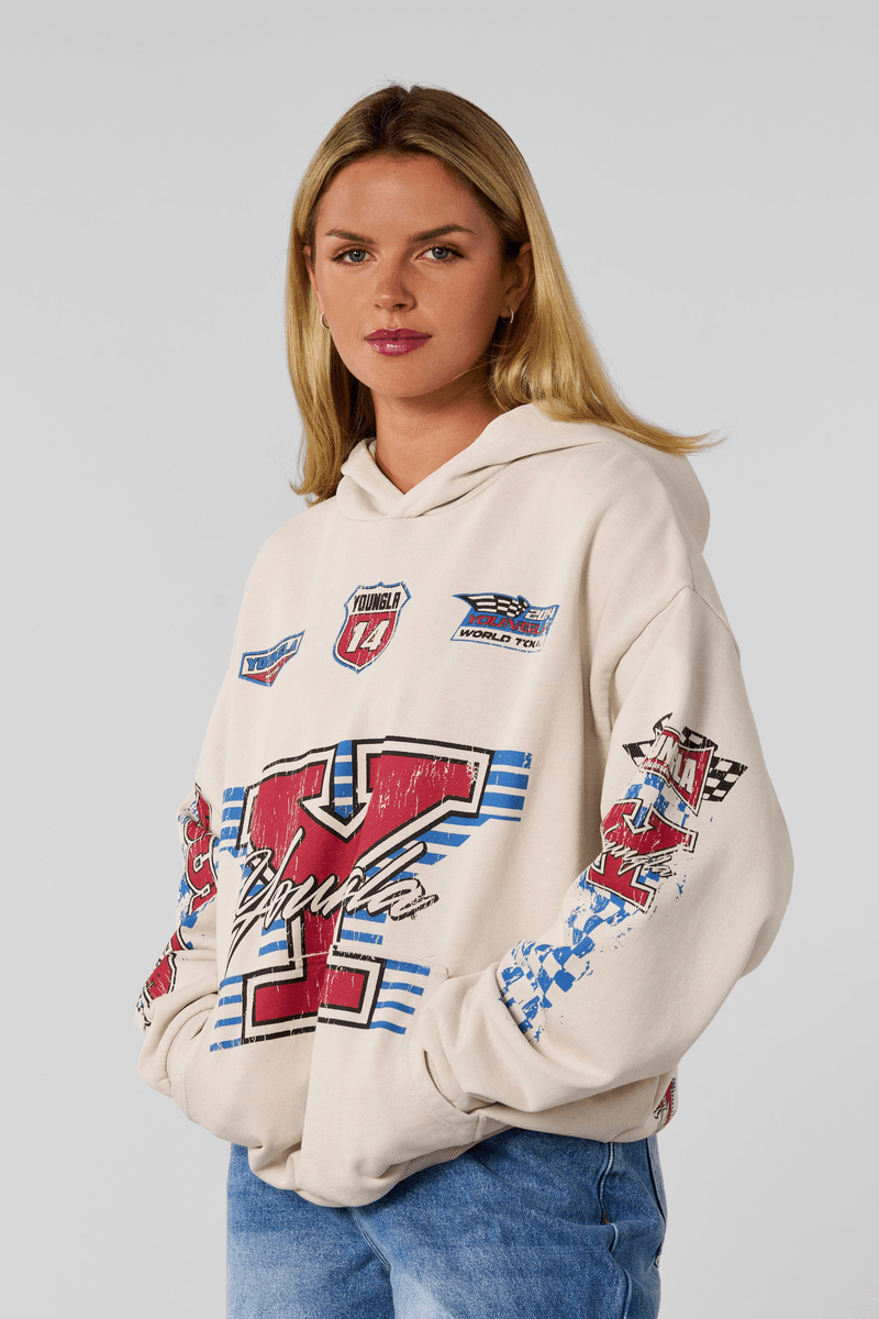 Discover the ultimate blend of comfort and street style with the Youngla W5193 Drift Hoodie Cream. This oversized hoodie is designed to make a statement, featuring bold racing-inspired graphics that set you apart from the crowd.
