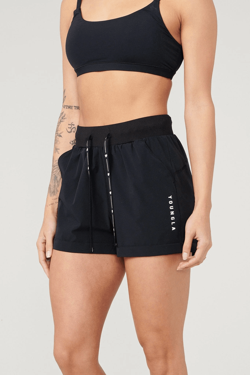 Featuring a supportive waistband with the iconic Youngla logo, these shorts are designed to move with you. The model in the photo is 5'4", wearing a size small, showcasing the flattering fit that these shorts offer for all body types.