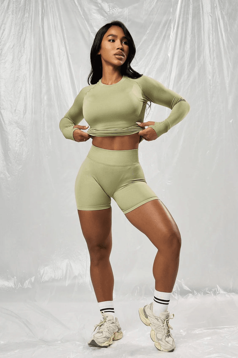 The Youngla W128 Legacy Seamless Shorts are crafted from our best seamless material yet, delivering buttery softness that moves with you. Designed to follow your body’s natural curves, these shorts are a must-have for anyone looking to feel confident while staying active. The model showcases the size small, standing at 5'5" with measurements of 36" bust, 25" waist, and 34" hips, emphasizing the true-to-size fit.