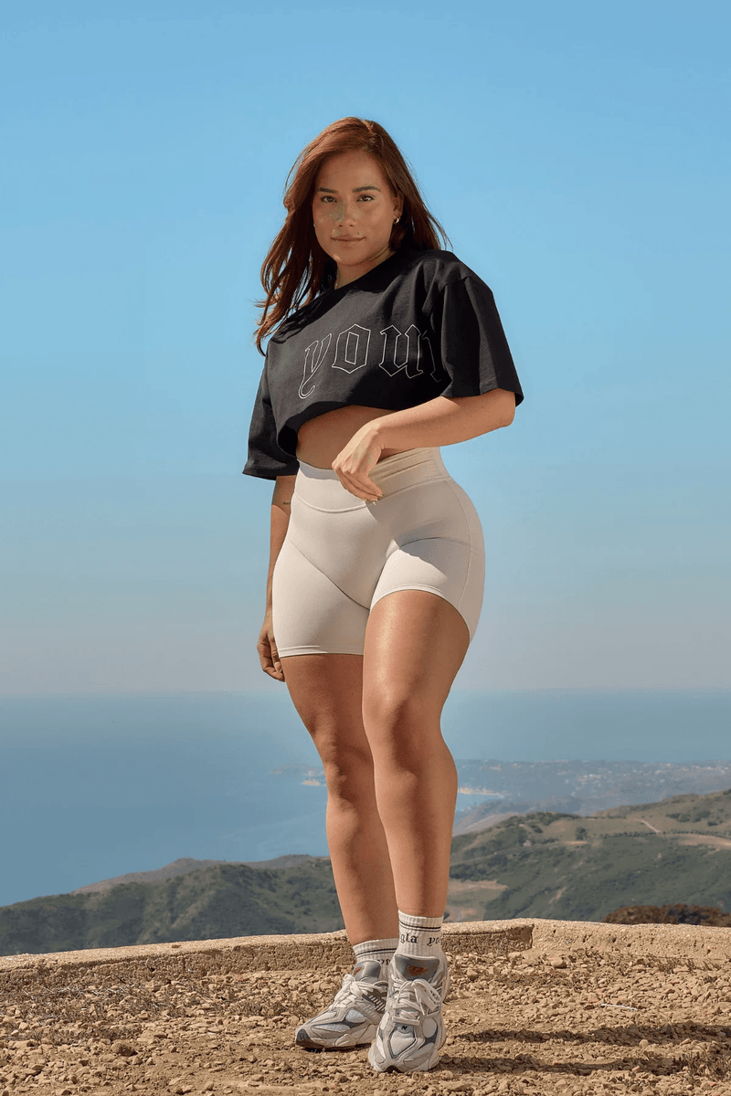 This versatile crop tee pairs perfectly with high-waisted jeans, shorts, or skirts, making it an essential addition to any fashion-forward wardrobe. The model in the first photo is 5'5" and wears a size small, showcasing how this tee flatters various body shapes.