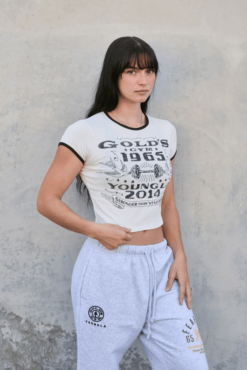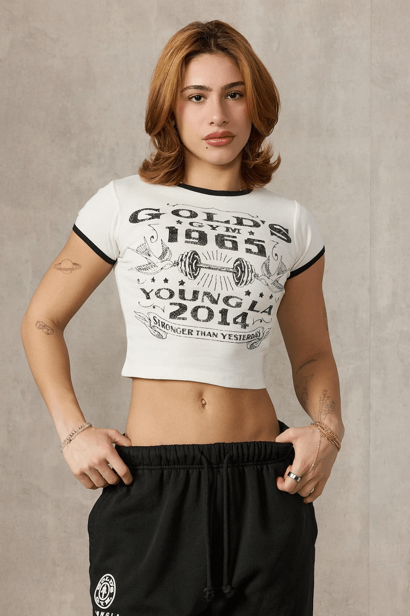 Elevate your casual wardrobe with the Youngla W471 Gold's Gym Ringer Baby Tee Off-White. This stylish tee combines comfort and fashion, making it an essential piece for any trendy closet.